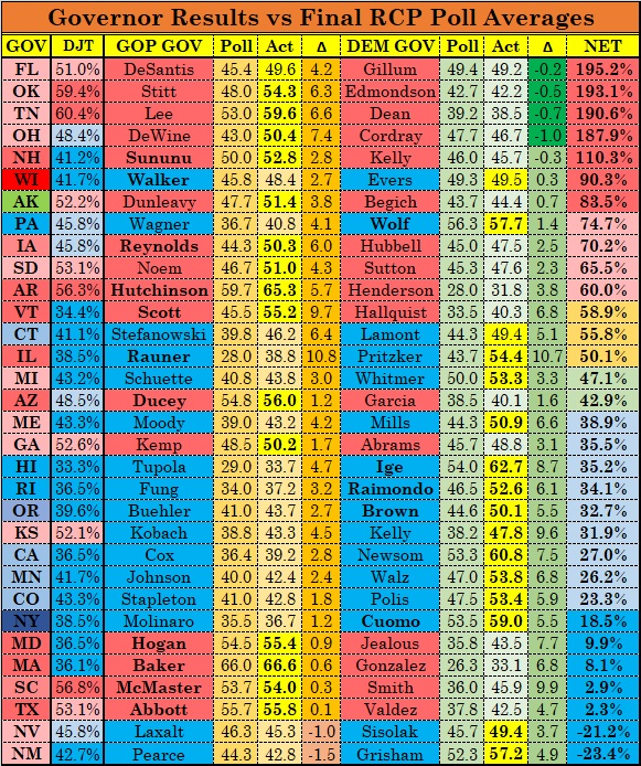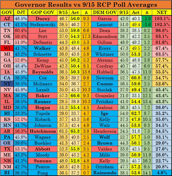 Yet again, we see here an overall pattern of more races breaking towards the Democrats, yet two of the three races that got away from the mid-September leader (Florida and Oklahoma, the other being Kansas) went to the Republicans, as did two of the three races that had been tied in mid-September (Georgia and Iowa, the exception being Maine). Some of that was just bad early polling combined with the lower public profile of gubernatorial elections: the RCP poll averages had both candidates under 40 percent in Rhode Island, Iowa, Maine, Kansas, Nevada, and Oklahoma in mid September.