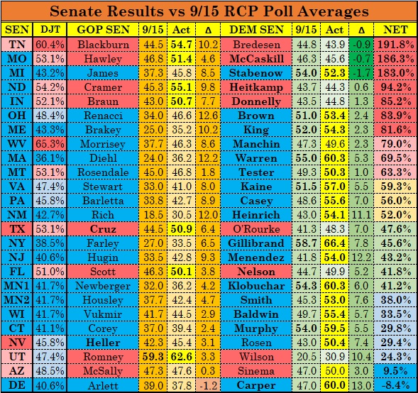 Now, let’s step back to the mid-September polling, given my initial thesis (backed up strongly by the outcomes in 2002, 2004, 2006, 2008, 2010, 2012, and 2014) that in a wave election, the races will shift consistently across the board to the wave party, so that the wave party will predictably win all the races where it leads in mid-September, and pick off a few more: