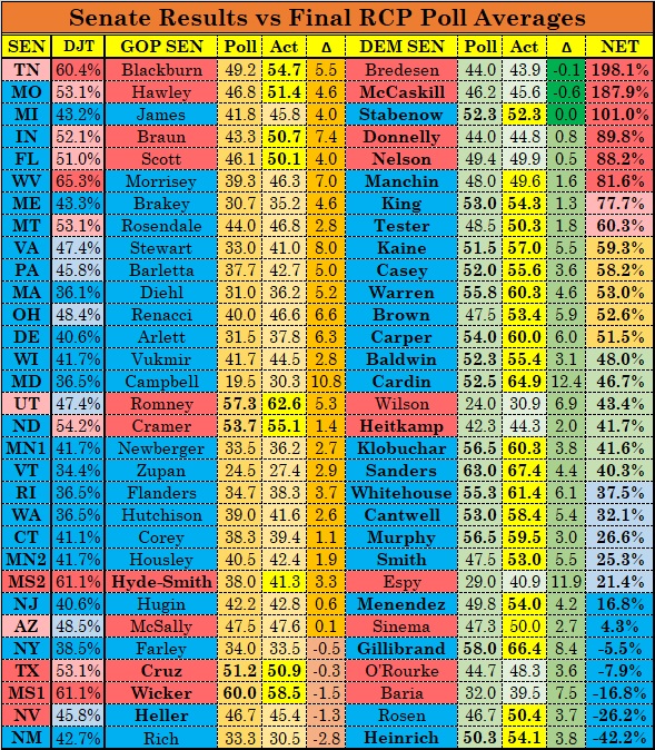That’s not how it turned out. Only three races ended up with a different outcome than the mid-September polls had predicted, and all three were basically dead heats at the time: Arizona flipped to the Democrats, and Tennessee and Indiana flipped to the Republicans. Combining the Tennessee blowout (Marsha Blackburn won by double digits), Mike Braun’s solid five-point win, and Republicans busting open small leads in Missouri and North Dakota and narrowing the races in West Virginia and Montana (and even ending a lot closer than projected in Ohio, Michigan, and Pennsylvania), it’s almost impossible to treat this as behaving like a traditional Senate wave. Democrats did win more easily than projected in Nevada (which was neck-and-neck well into October), New Jersey, Wisconsin, and Minnesota, and the apparent break towards Corey Stewart in the Virginia race is partly attributable to there being very little polling after Labor Day, but there was only one race besides Arizona where Democrats pulled ahead after trailing in mid-September — Florida — and they ended up losing.