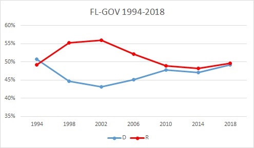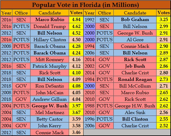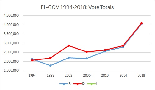 In percentage terms, the large majorities rolled up by Jeb Bush started to erode when Charlie Crist was elected against the Democratic wave in 2006 and have evaporated since then; Rick Scott and now Ron DeSantis won the last three races by razor-thin margins. But DeSantis’s win was quite different in raw numbers of votes cast: