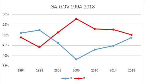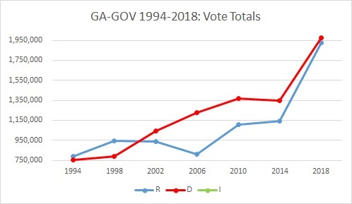 The state’s dramatic population growth makes it hard to usefully compare Florida elections over the long run, but you can see here that the 2018 vote totals look a lot more like presidential turnout in Florida than they do like a normal midterm. Now, the trend in Georgia:
