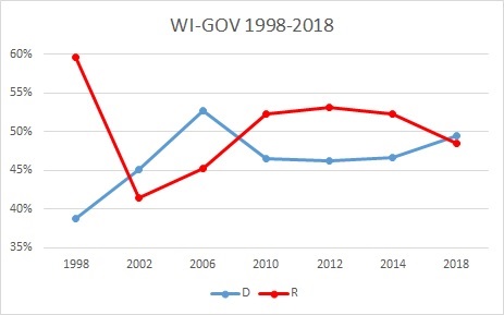 Scott Walker, unsurprisingly, finished more strongly than the polls predicted, though ultimately not strongly enough to win a third term. If you look at the history of the Wisconsin governor’s races going back to the last of Tommy Thompson’s four consecutive victories as the state’s previous Republican governor, you can see that while Walker’s majority support eroded this time, it was a narrow loss from what was never a very large majority: