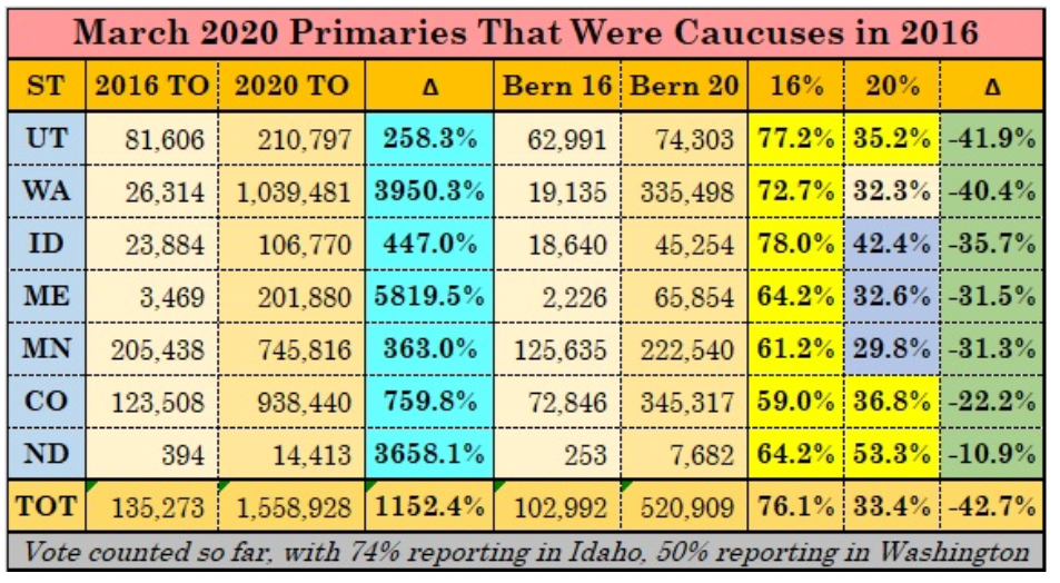 One thing that has plainly hurt Sanders is that Democrats switched most of their 2016 caucuses to primaries. Minnesota, Maine, Idaho, and Washington all flipped from caucus victories for Sanders to primary losses or dead heats as the electorate expanded. (North Dakota switched to a modified party-run primary, which Sanders won.) The pattern of diluting Sanders’s support in a much broader electorate has held across the states that changed formats. In every state, the number of Bernie voters went up, but the turnout went up a lot more: