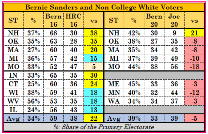 Outside of Missouri, this was a heavily pro-Sanders voting bloc in 2016; outside of New Hampshire, he has consistently lost these voters to Biden. Notice as well that non-college white voters have actually tended to be a larger share of the vote in 2020 than in the 2016 primaries.