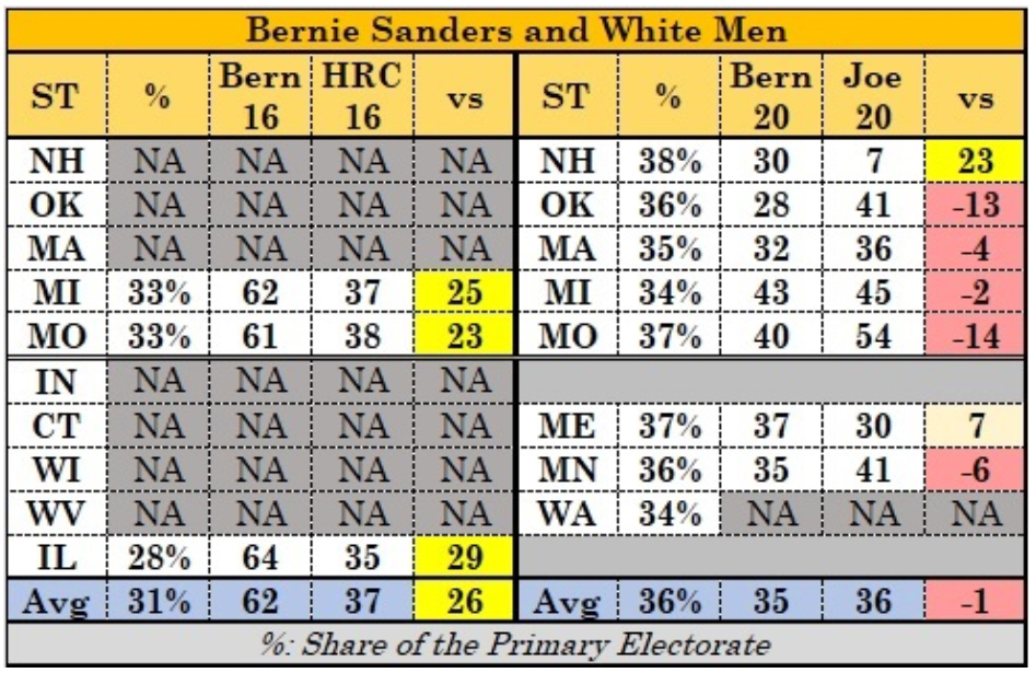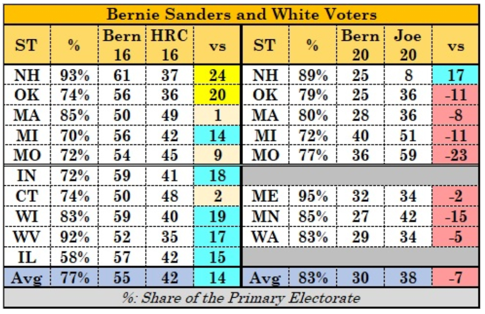 Mr. Biden defeated Mr. Sanders by 10 points, 38 percent to 28 percent, in counties across Maine, Minnesota and Massachusetts where white voters made up at least 80 percent of the electorate and where college graduates represented less than 40 percent of the electorate . . . This is a marked departure from 2016. Back then, Mr. Sanders tended to excel among white, working-class and rural voters across the North. This made Michigan, where white voters represent a well-above-average share of the Democratic electorate, one of his stronger states. He dominated in Michigan’s small towns and rural areas, losing only in few counties that tended to have older voters.