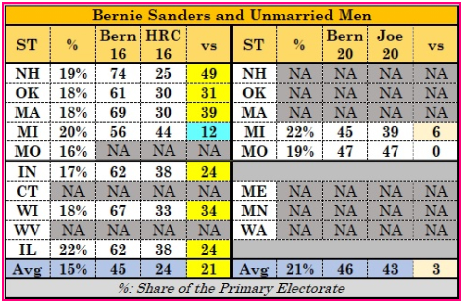 The lopsided pro-Sanders vote among these two overlapping groups in 2016 is undoubtedly partially driven by gender and Hillary Clinton’s uniquely grating impact on men. In either case, Sanders is now regularly losing white men, flipping from a 25-point advantage to a two-point deficit in Michigan. He has also lost almost his entire broad advantage among unmarried men: “Bros for Joe.”