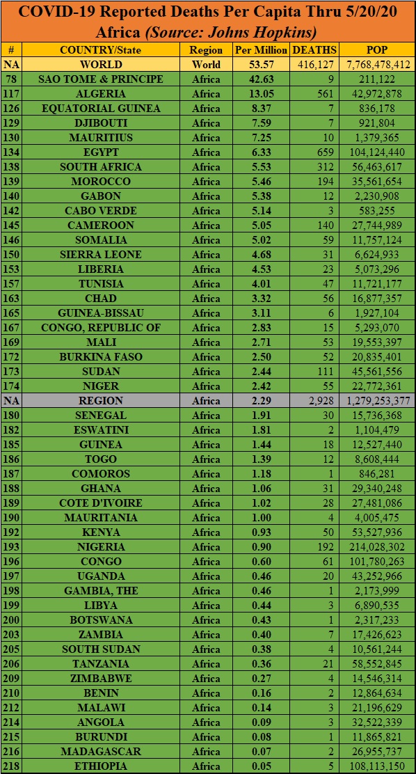 Sao Tome and Principe’s high death rate may be partly a statistical fluke due to its small size. Algeria’s presence near the top of the list is undoubtedly at least partly a factor of its continuing close ties with neighboring France.