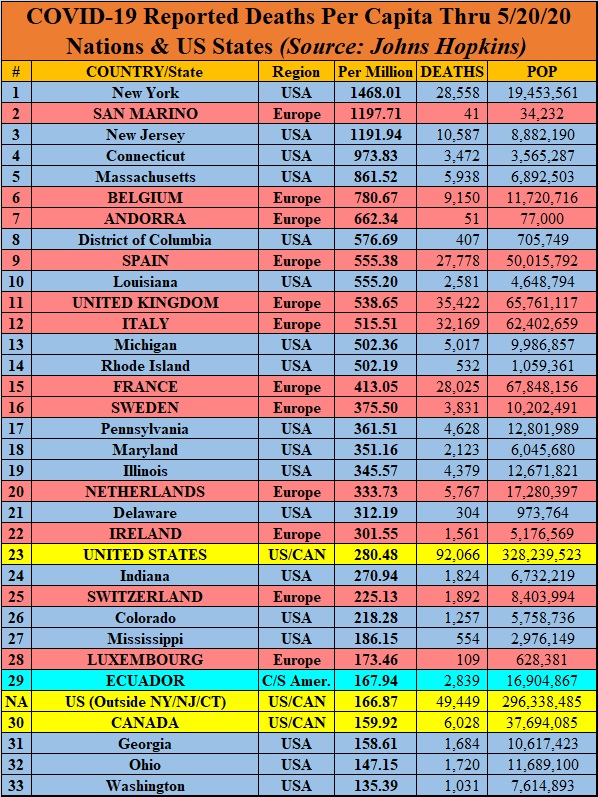 Here’s the 33 jurisdictions (nations or U.S. states) with the highest per-capita death rates:
