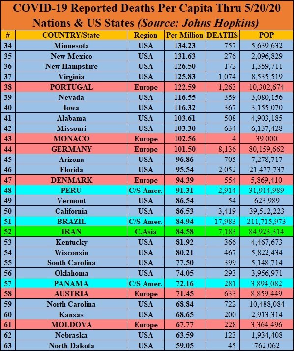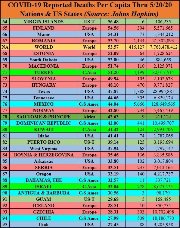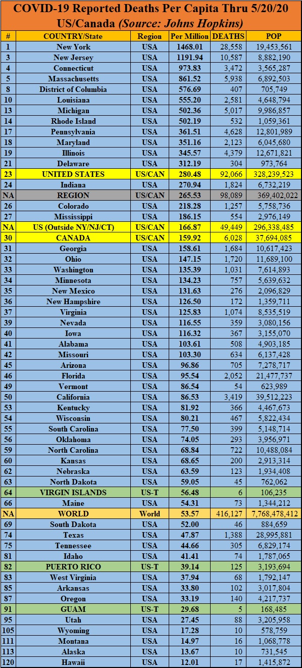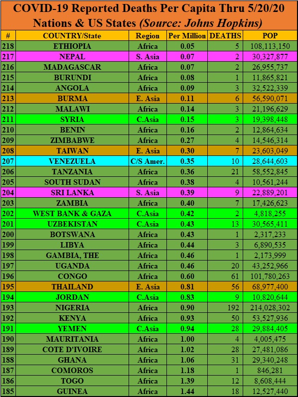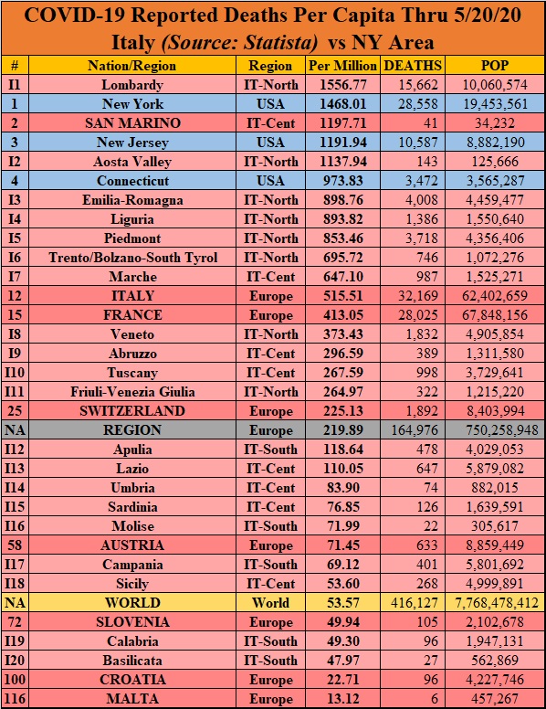 I’ll use the data from the COVID-19 Dashboard by the Center for Systems Science and Engineering (CSSE) at Johns Hopkins University (JHU), which is as good a source for comparable data as any. The numbers are pulled from the Johns Hopkins site as of the morning of May 20, 2020. U.S. data is available on a state-by-state basis, which allows us to compare variations within the United States to national data elsewhere. I’ve color-coded countries by broad geographic regions, which requires lumping together some places — for example, I included Australia and New Zealand with East Asia, despite major differences in their societies, on the basis of geography. Also, 14 countries with populations of a million or more are listed as having zero COVID-19 deaths; presumably, most or all of these are just not reporting data or are refusing to admit they have cases: Vietnam, Mozambique, North Korea, Cambodia, Rwanda, Laos, Papua New Guinea, Eritrea, Central African Republic, Turkmenistan, Mongolia, Namibia, Lesotho, and Timor-Leste. Regional numbers for Italy are via Statista.