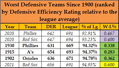 Now, it’s time to update the list in the other direction: the worst defensive teams since 1900. Between 1900 and 2019, only three teams had a DER that was below 95 percent of the league average. All three teams were awful. Two were famously bad teams:
